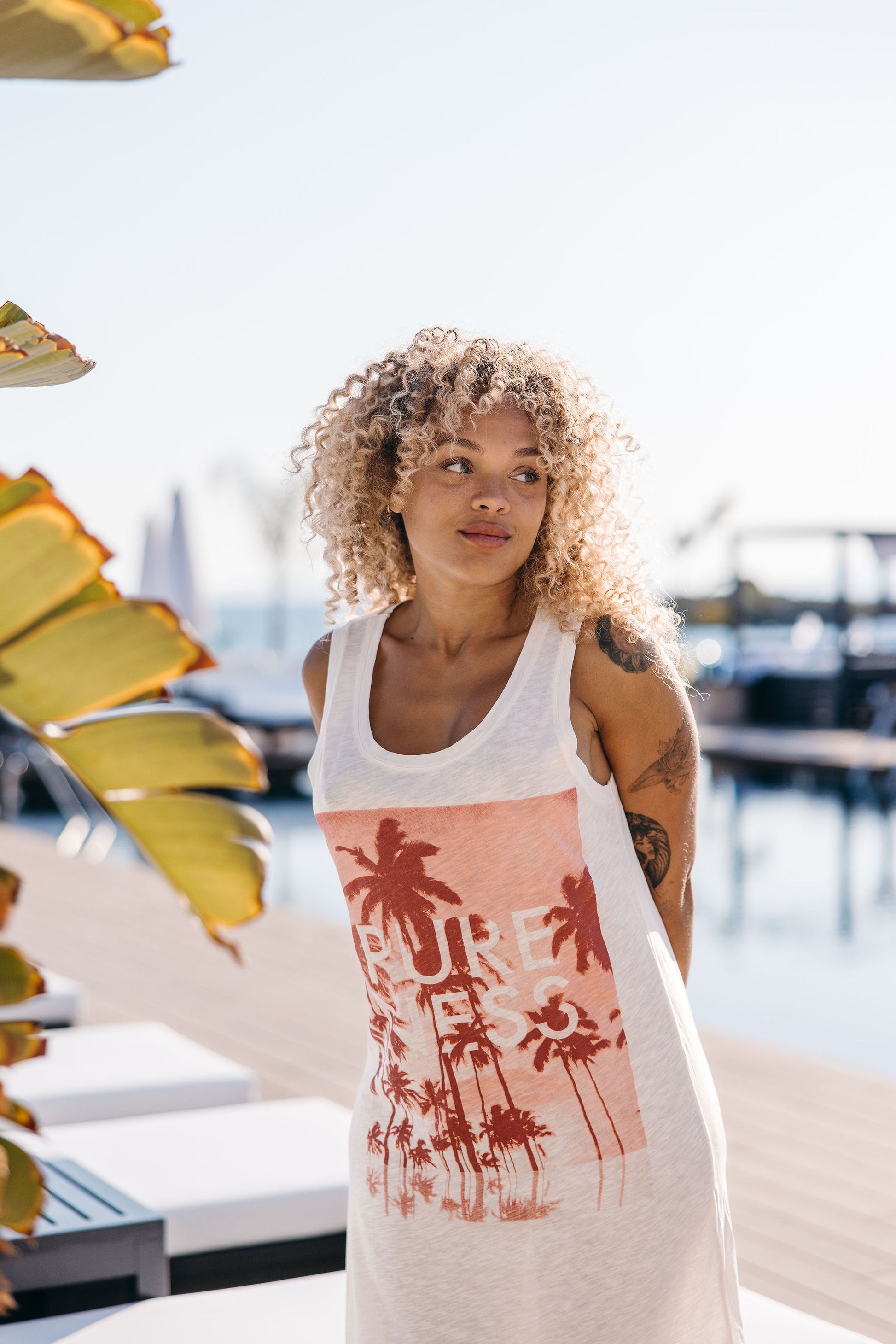 Long straight dress with beach-inspired photographic print. It has side openings that give freshness and mobility. Garment-dyed dress with extra smooth finish. 100% cotton.
