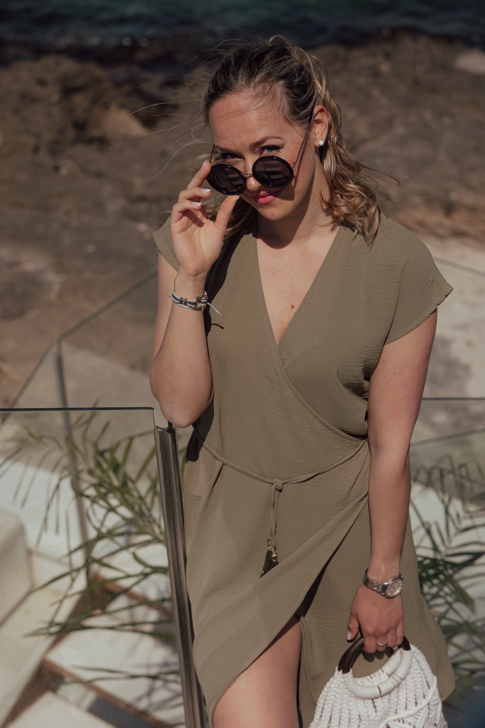 Crossed dress, very feminine silhouette with V neckline and pom pom detail which adds a point of sophistication.