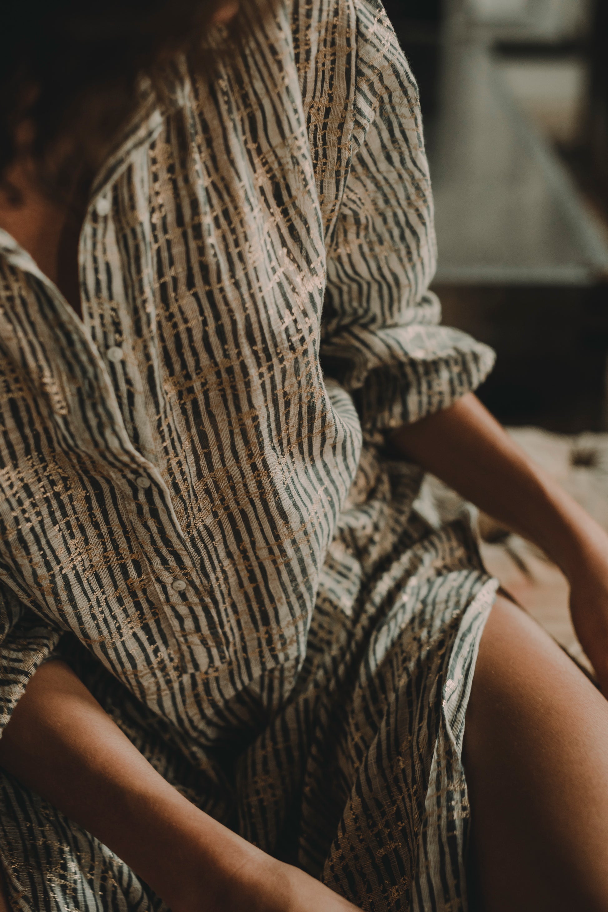 Shirt dress with side slits and fantasy fabric with striped print and gold details.