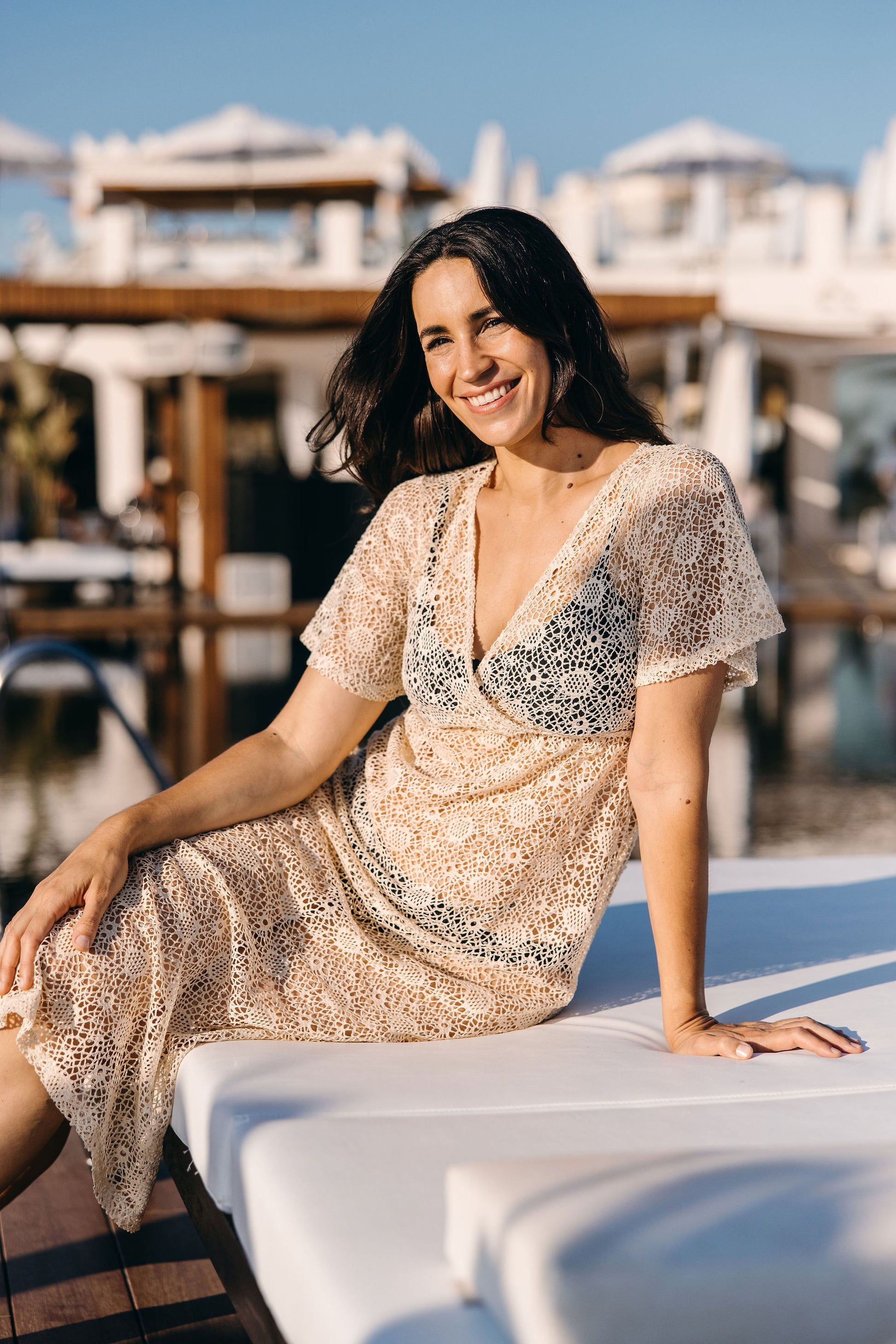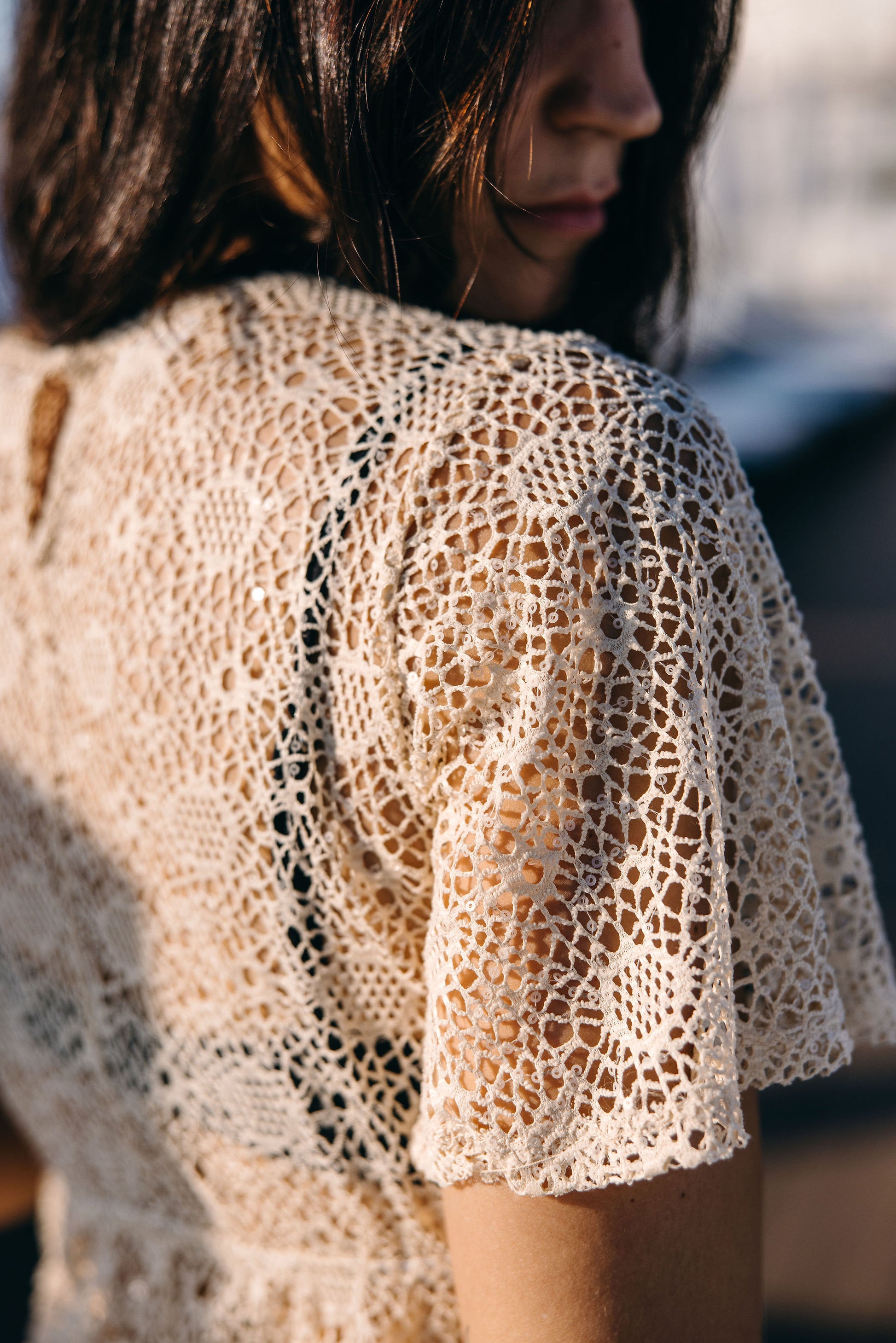 Crochet dress with sequin detail that provide a delicate shine, nude color.