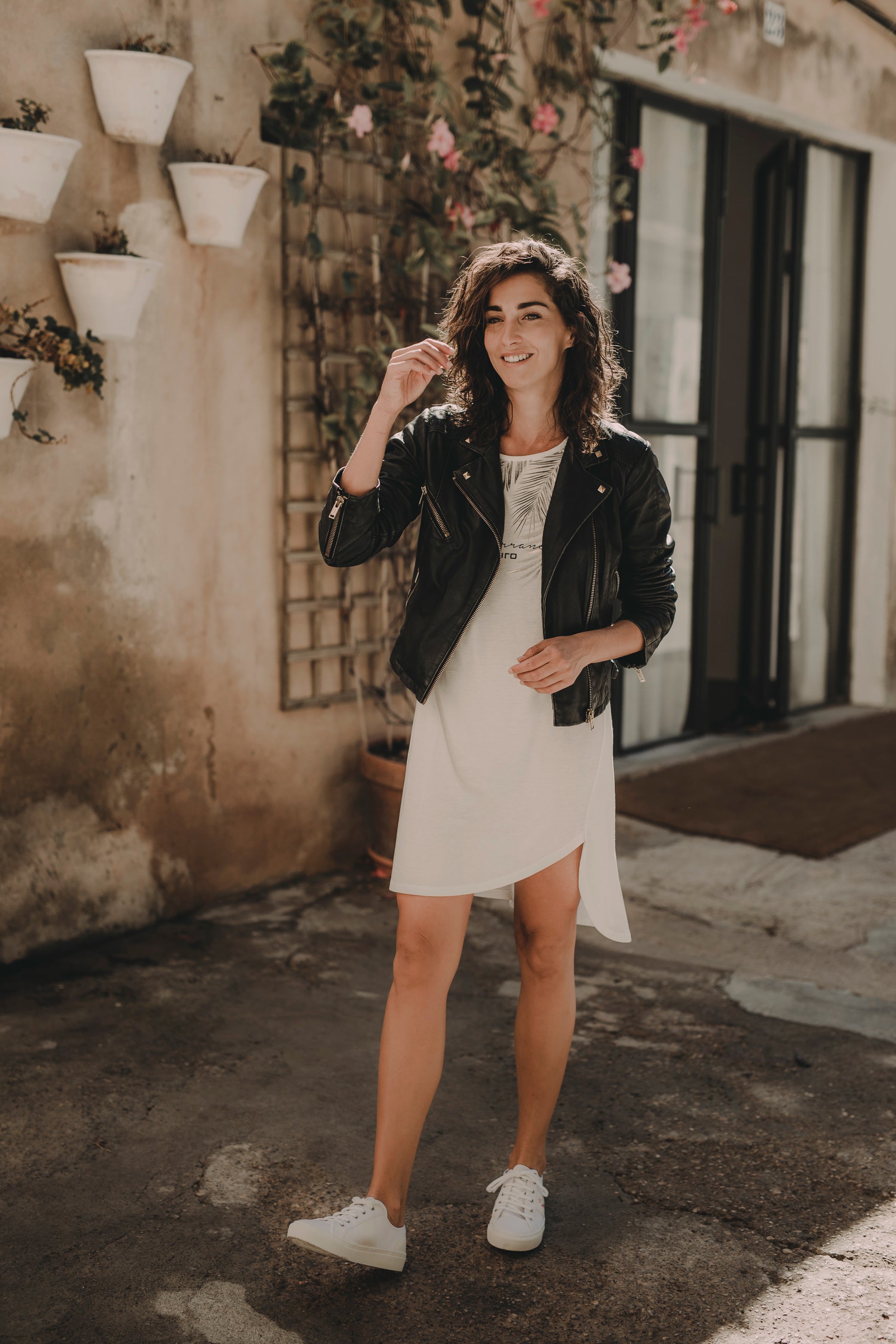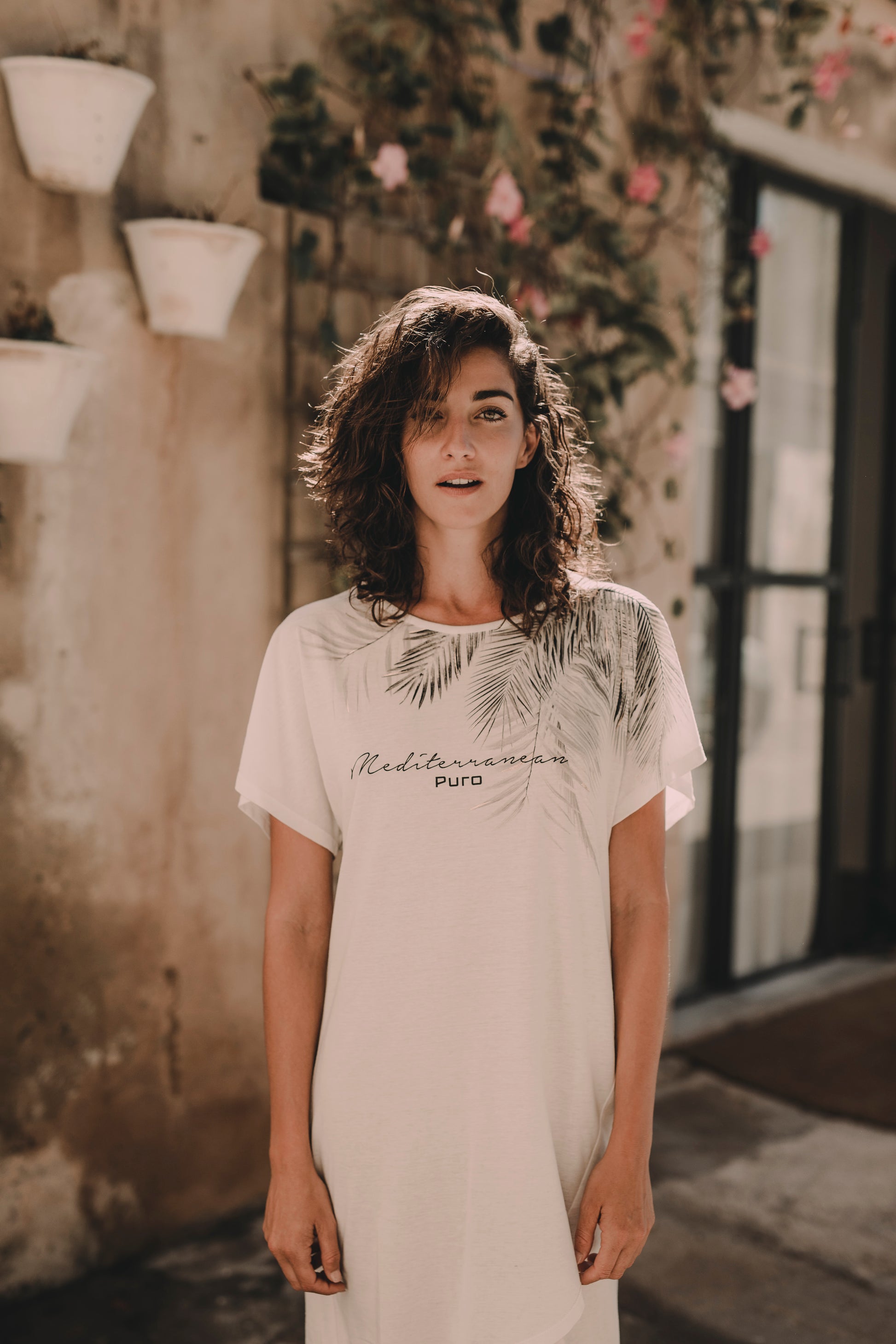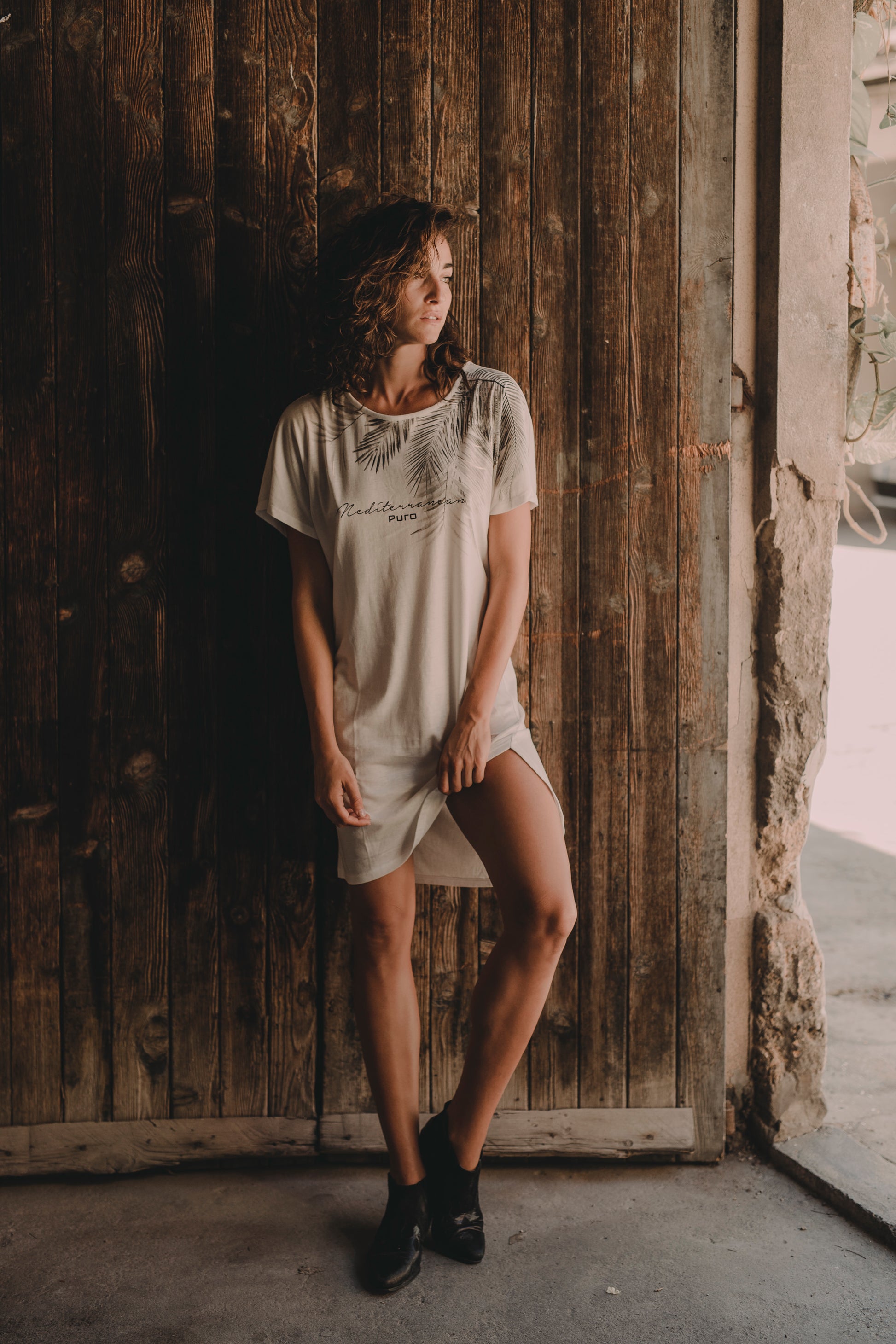 Dressed T-shirt with round neck and cape sleeves. Palm tree print and text with golden details. Versatile garment that can be used as a t-shirt or dress, depending on the client's taste.