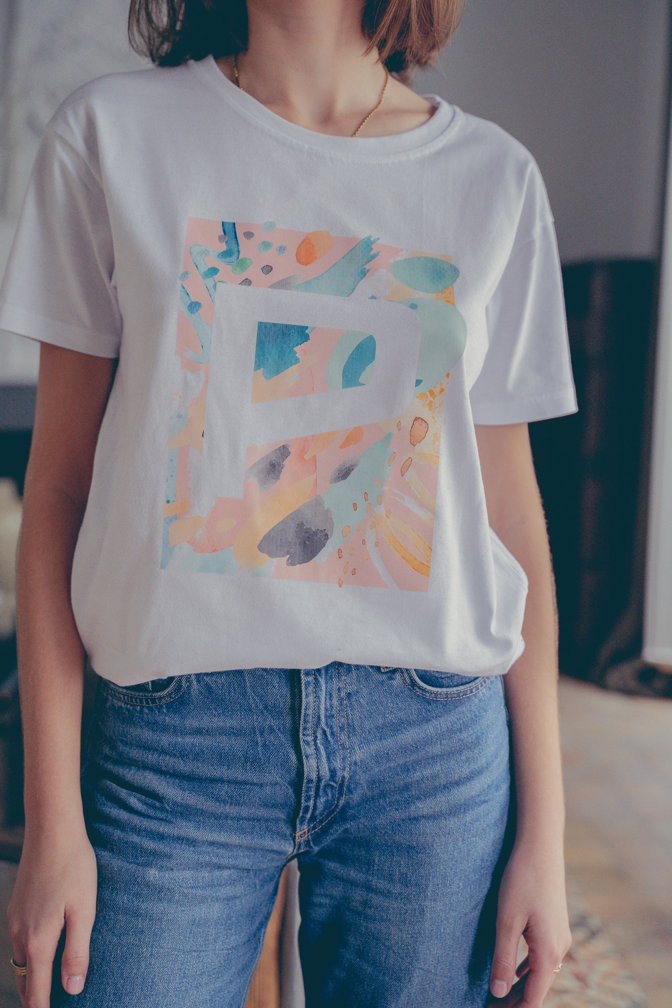 100% cotton white t-shirt with a print of our Puro "P" logo and a watercolor background inspired by the colors of the spring.