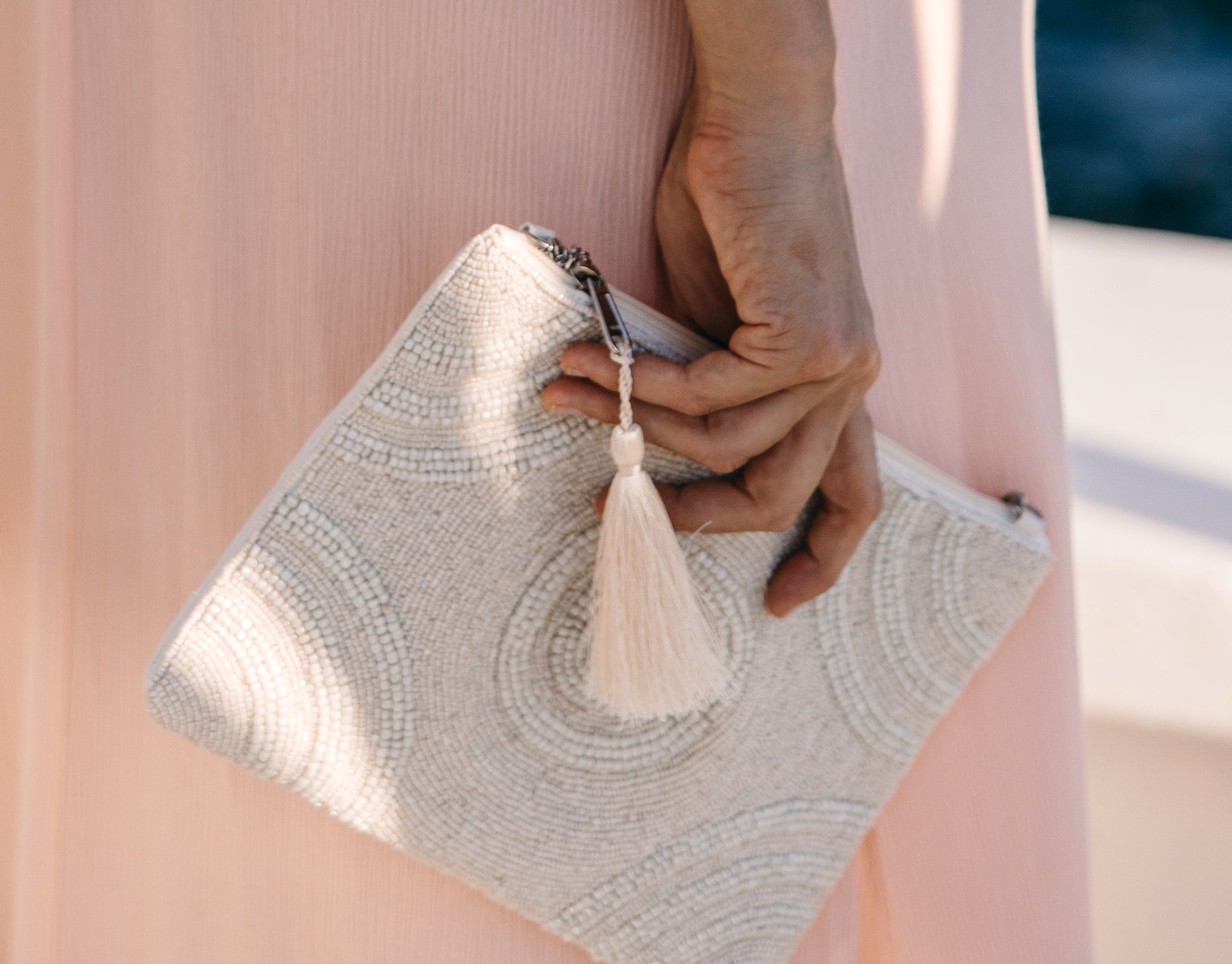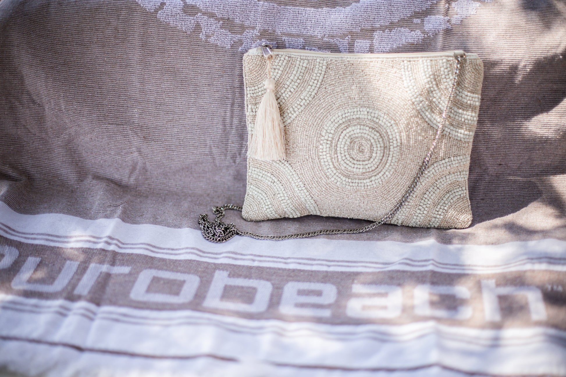 Bag inspired by sea pearls. White with pompom. Zip closure