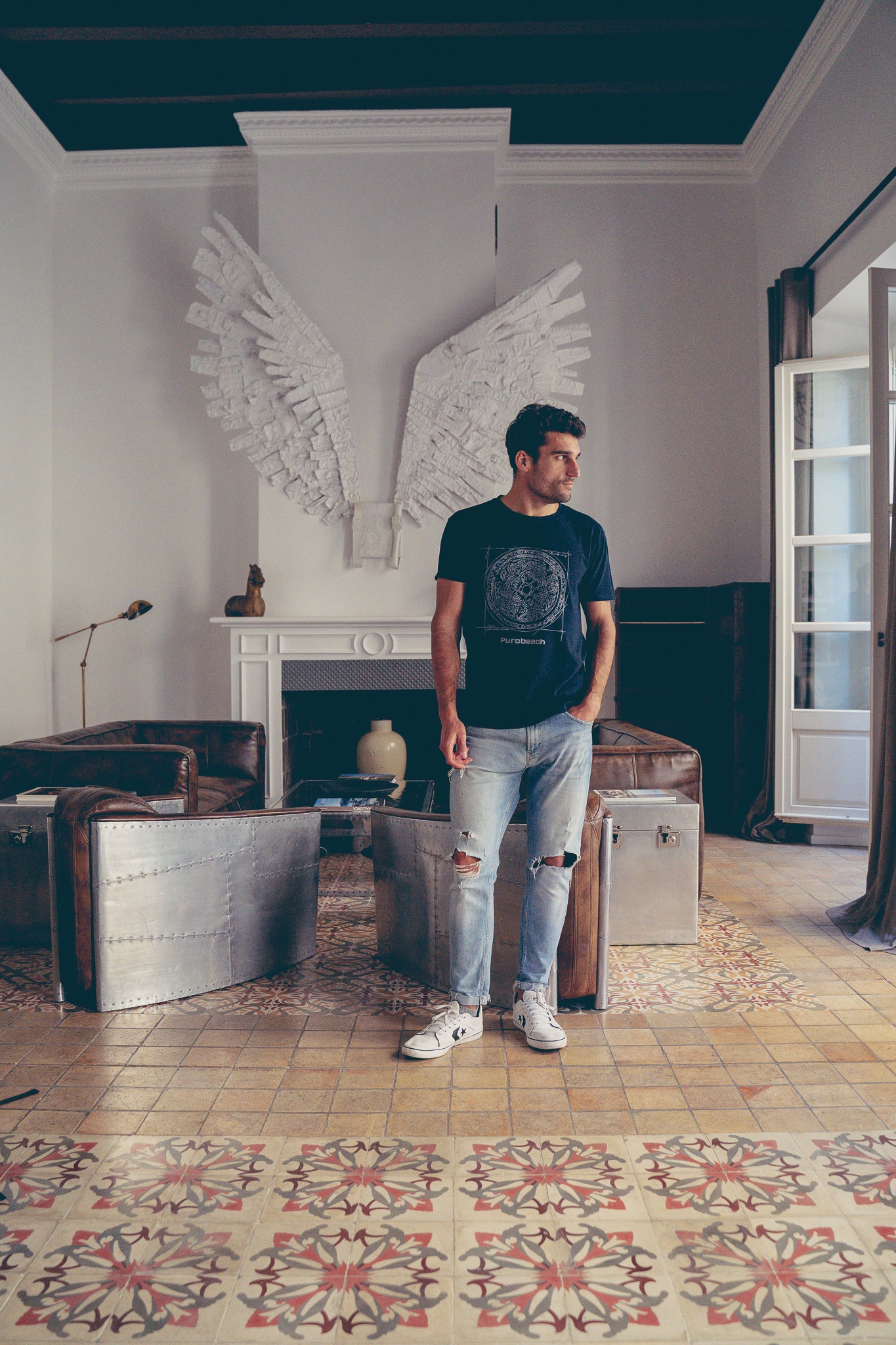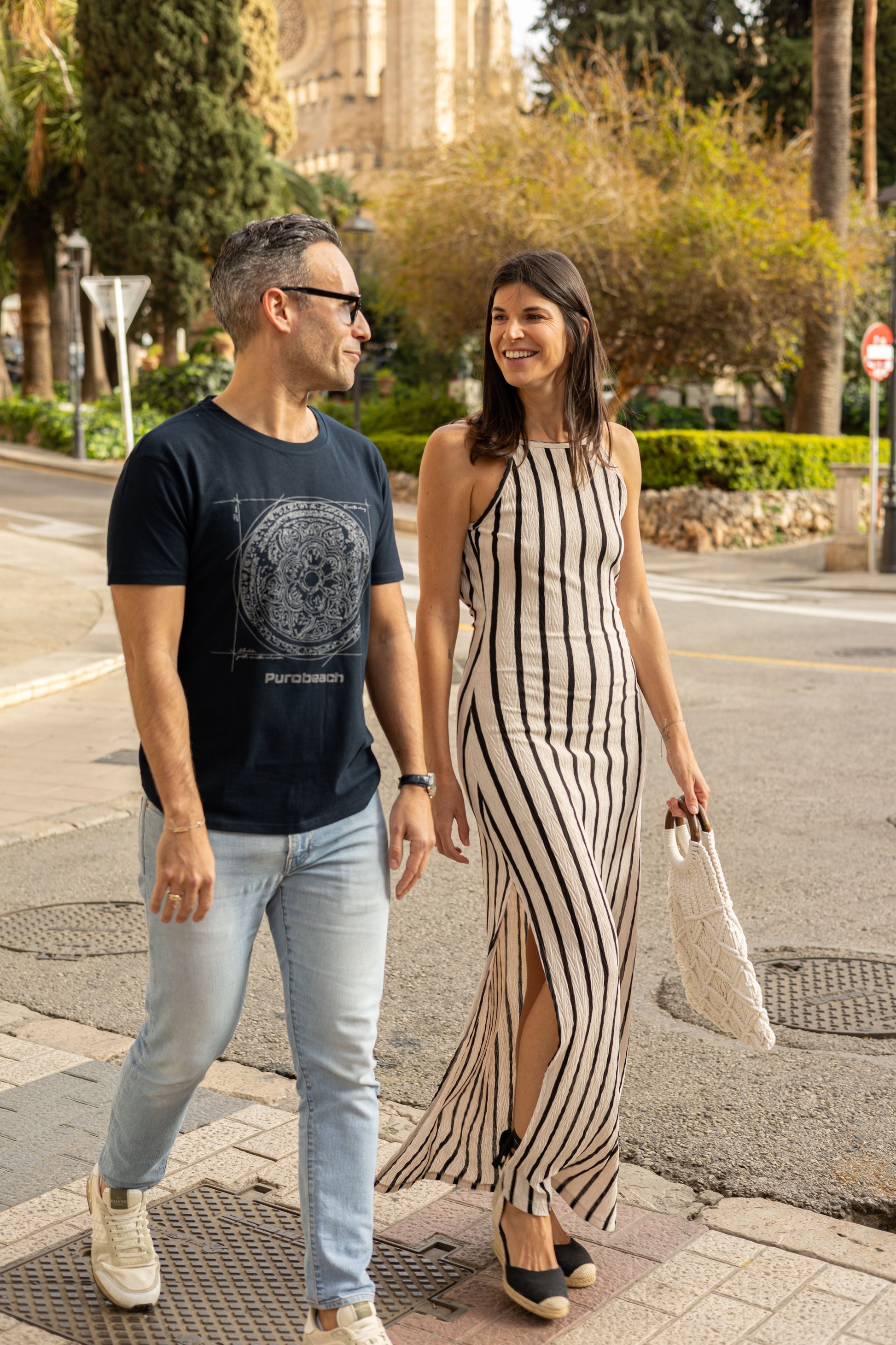 100% Cotton t-shirt, blue color and grey print, our Mandala logo with a technical drawing inspiration. You will find these phrases in the print, in a very subtle and delicate way: "Escape the ordinary" and " Mandala: growth, connection and passion.