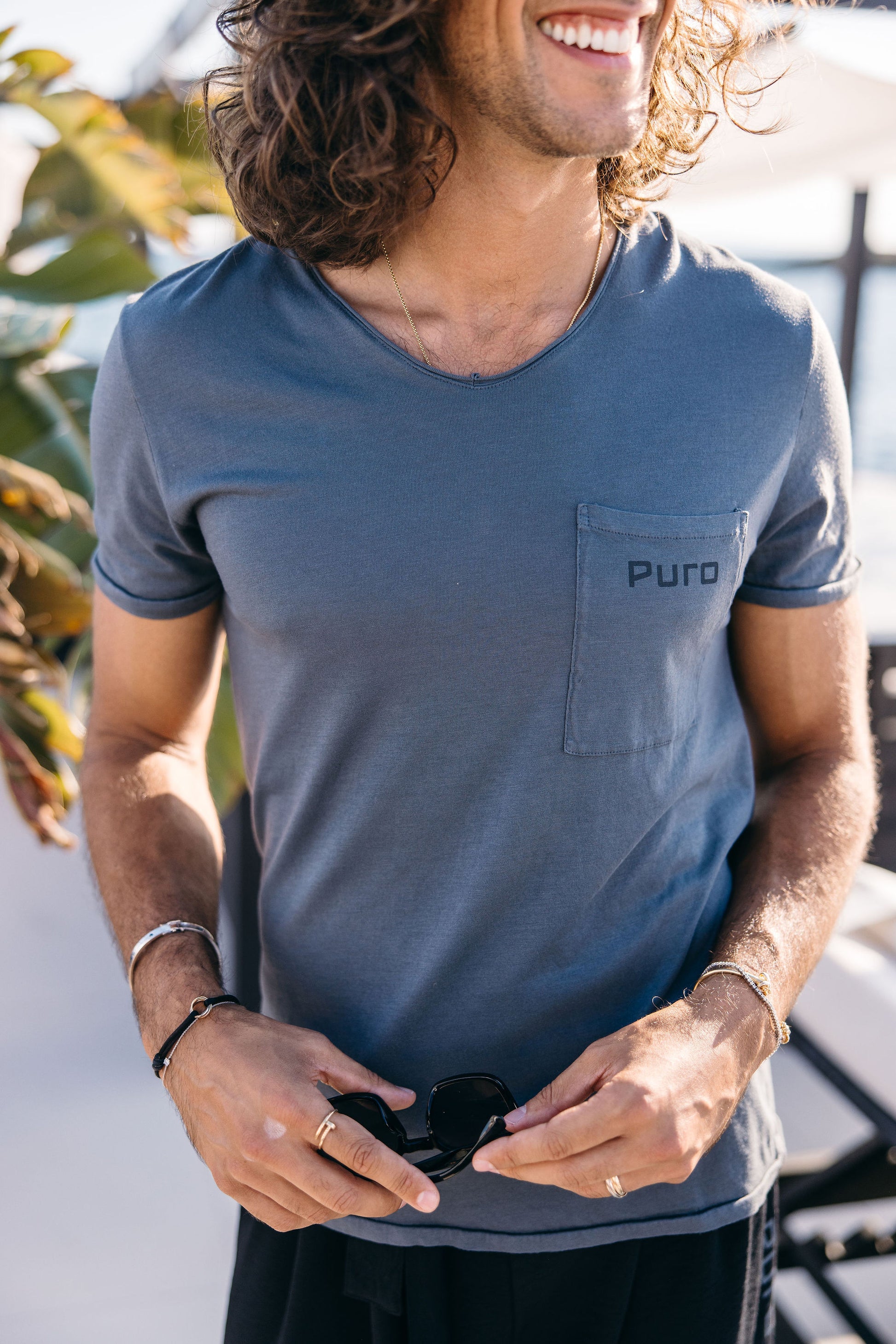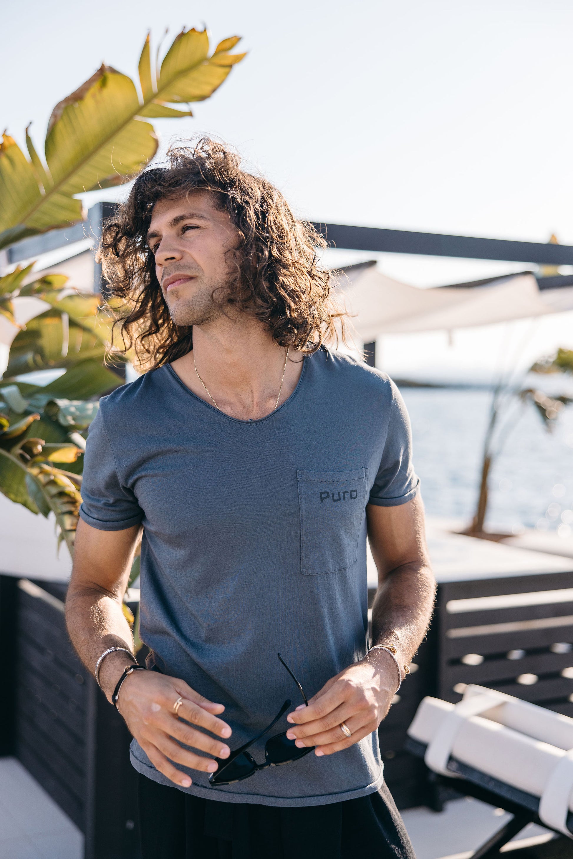 Basic men's t-shirt with a V-neck and a side pocket on the chest. Manda-la Puro print on the back. Garment dyed t-shirt with extra smooth finish.